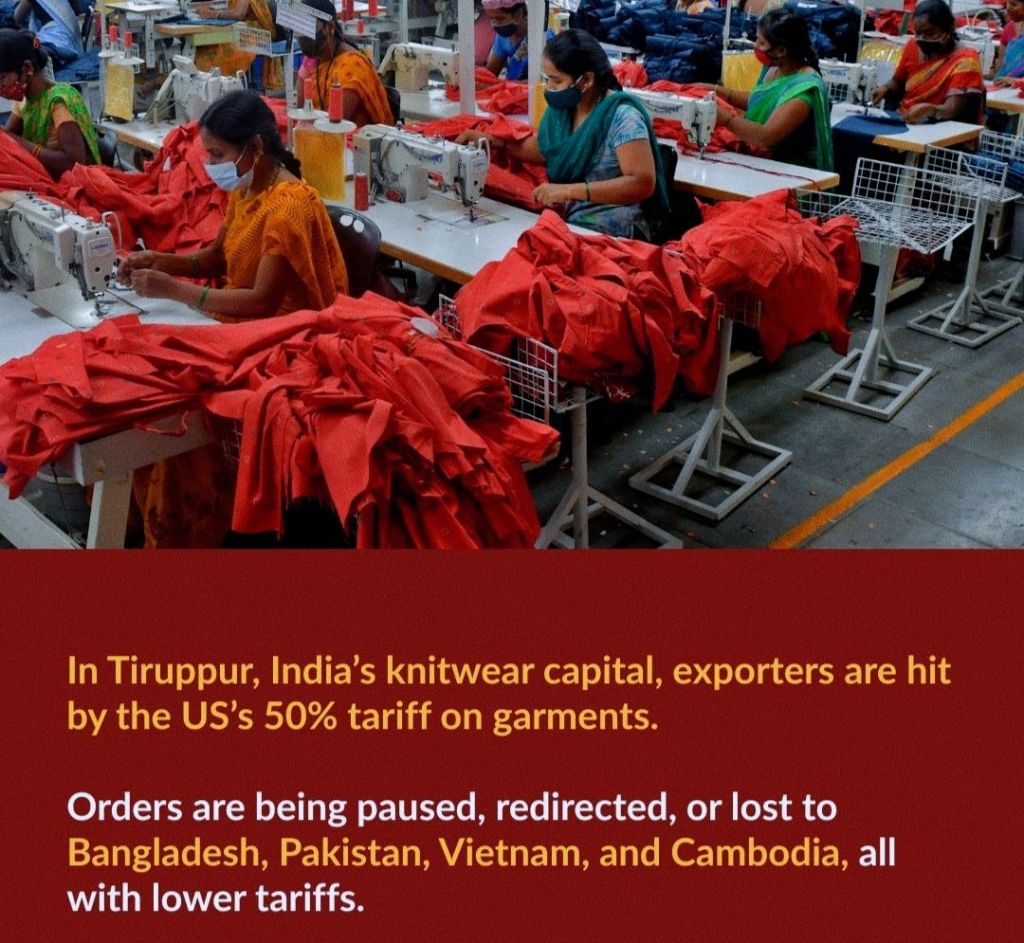 Tamil Nadu’s Tiruppur, the global knitwear hub, found itself ensnared in the same crisis. For an industry where U.S. retailers account for nearly 40 percent of orders, the blow was lethal. Buyers abruptly canceled contracts, citing untenable costs. Reports emerged of American retail chains directing factories to dispatch only what was ready before the tariff deadline, leaving unfinished consignments stranded. Thousands of small knitwear units shuttered operations. The collapse rippled through transporters, dyers, spinners, and allied trades, threatening nearly 300,000 livelihoods. With annual turnovers exceeding $5 billion, Tiruppur’s once-resilient economy now stares into the abyss. The pain is not only economic but social, as entire families tied for generations to garment work confront their first existential crisis.