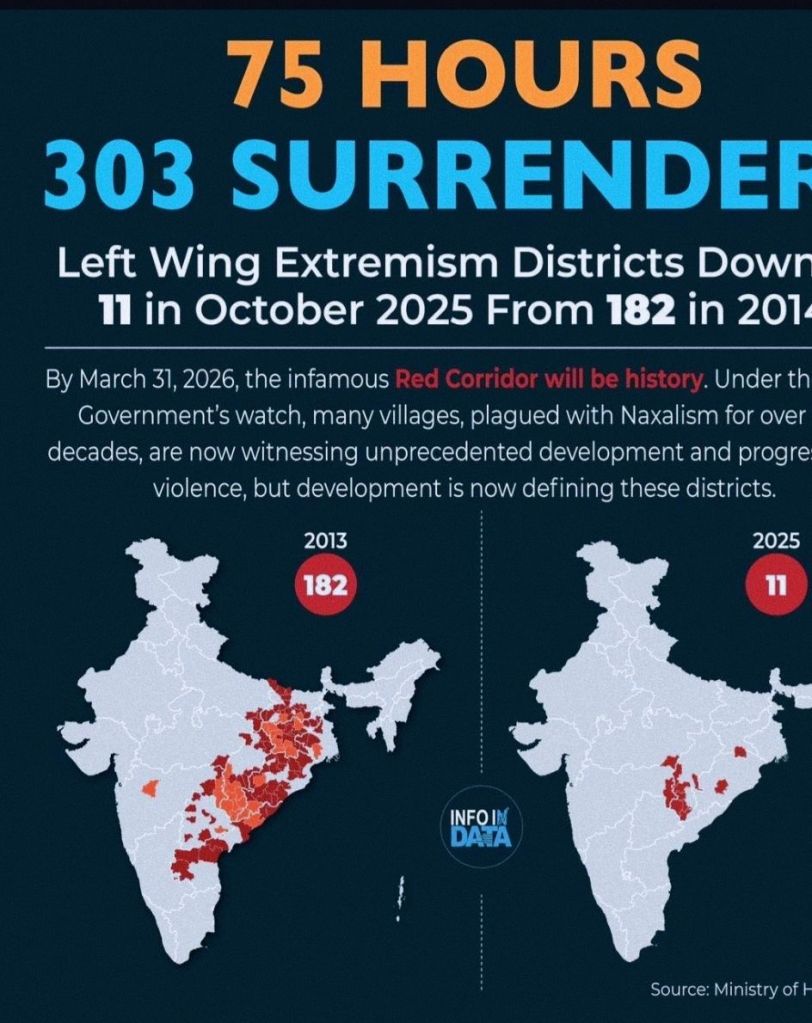 This remarkable yet understated achievement reflects a governance philosophy grounded in perseverance and inclusivity. Where earlier regimes accepted prolonged insecurity as an inevitability, today’s approach has been to confront and resolve it — village by village, family by family. The true success lies not in the statistics, but in the lived experiences of communities who now walk freely, send their children to school, and plan for a future once unimaginable. India’s reclaimed peace is not a matter of celebration alone — it is a strategic asset powering the nation’s economic and geopolitical aspirations. As global observers admire the rise of a confident India, the most profound chapter is being written in the quiet forests of the former Red Corridor — where fear once ruled, hope now leads. Because the greatest victories of a nation often emerge not from military parades, but from the hearts of citizens who are finally free from fear.